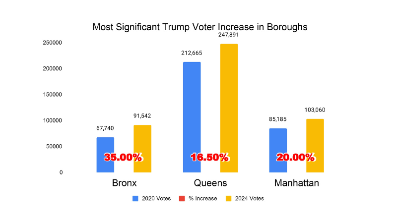In the 2024 presidential election, Donald Trump experienced a significant surge in support across all boroughs of New York City, marking a noticeable shift in voter preferences. While New York City remains a stronghold for Democrats, Trump’s increased performance in traditionally liberal areas signals a potential change in the city’s political landscape.